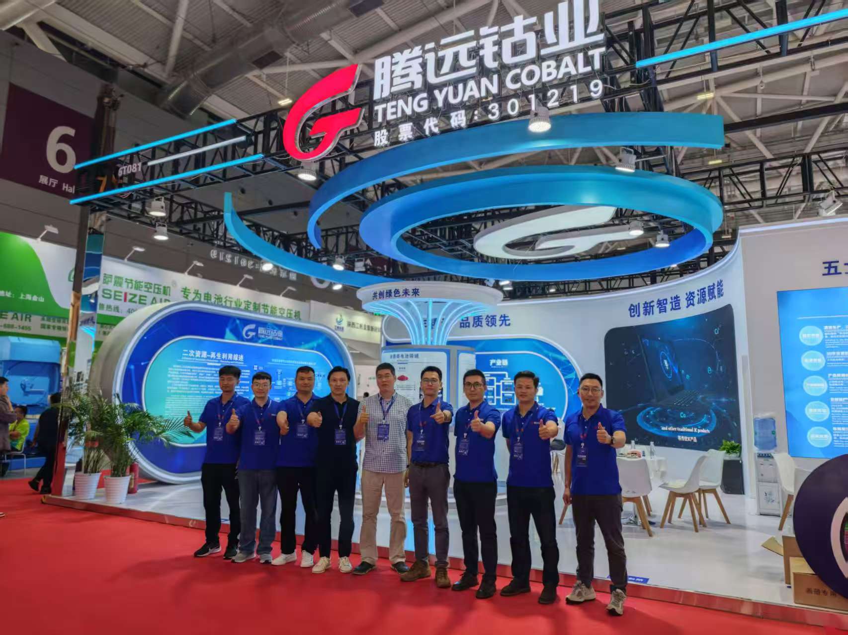 展會現(xiàn)場,騰遠鈷業(yè)的科技藝術展臺設計吸引了眾多客戶和行業(yè)觀眾駐足咨詢。整體設計以鈷藍色為主色調(diào),搭配簡潔流暢的線條與充滿未來感的光影效果,既彰顯了鈷材料的深邃神秘,又傳遞出企業(yè)開拓創(chuàng)新的進取精神。展臺劃分為產(chǎn)品展示區(qū)、二次資源技術展示區(qū)、客戶交流互動區(qū)等多個功能區(qū)域,通過屏幕展示、實物模型陳列等多種形式,全方位、立體式地呈現(xiàn)企業(yè)在電池行業(yè)產(chǎn)業(yè)鏈中的重要地位。