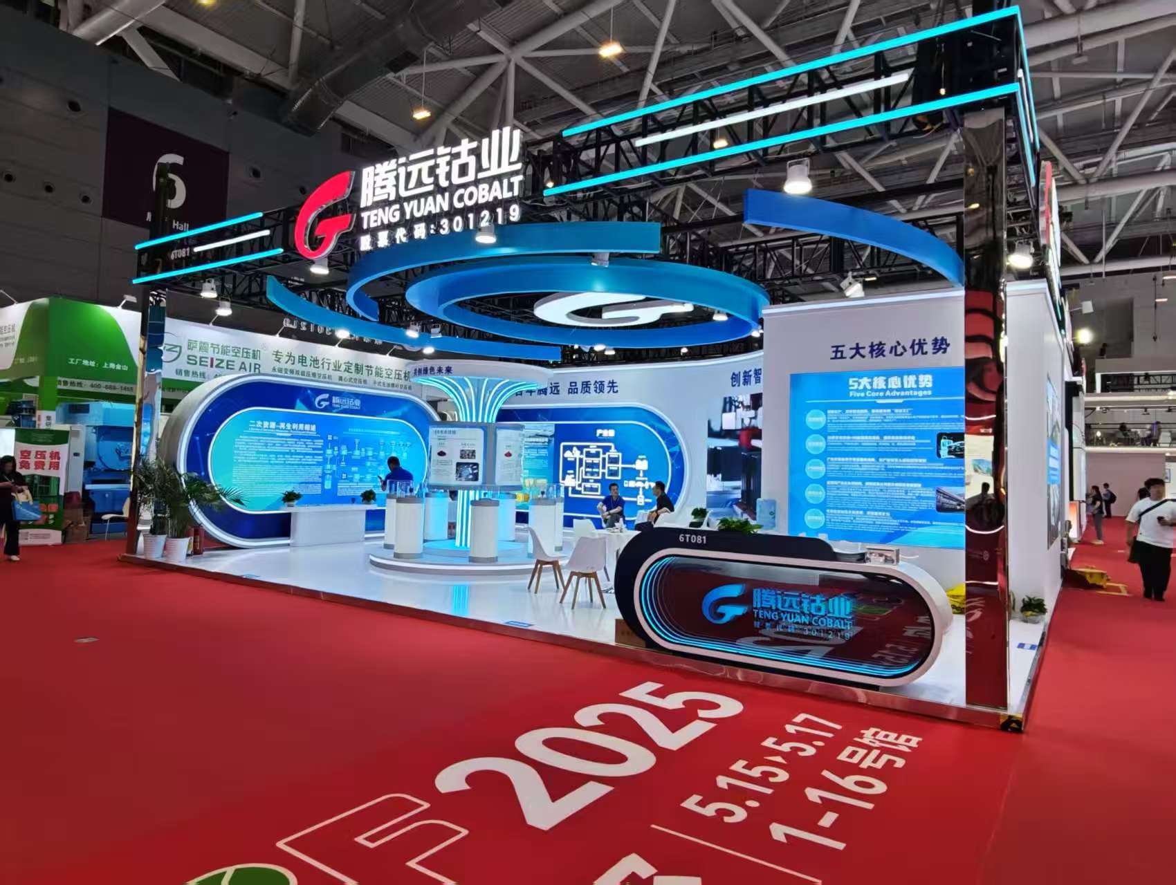 展會現(xiàn)場,騰遠鈷業(yè)的科技藝術展臺設計吸引了眾多客戶和行業(yè)觀眾駐足咨詢。整體設計以鈷藍色為主色調(diào),搭配簡潔流暢的線條與充滿未來感的光影效果,既彰顯了鈷材料的深邃神秘,又傳遞出企業(yè)開拓創(chuàng)新的進取精神。展臺劃分為產(chǎn)品展示區(qū)、二次資源技術展示區(qū)、客戶交流互動區(qū)等多個功能區(qū)域,通過屏幕展示、實物模型陳列等多種形式,全方位、立體式地呈現(xiàn)企業(yè)在電池行業(yè)產(chǎn)業(yè)鏈中的重要地位。
